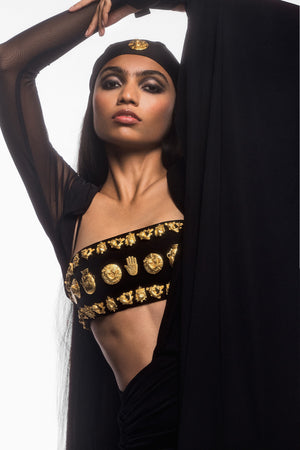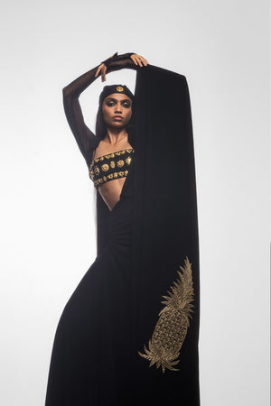 Details: This draped saree is unique in its drape as well as its look. with ruching and a trail on the side and a long pallu with our signature Ananas motif embroidered across. The bustier is Heavily charmed with a mix of our Matsya and Akan Ghana Mask charms paired with a mesh bolero that has thumbholes to add that extra 'oompf'.