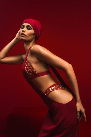 Styling: Style this set with a pair of our very own mascot sandals and some statement jewlery. Pair the Ruby bra with our cotton silk lungi draped DIY style as a separate.