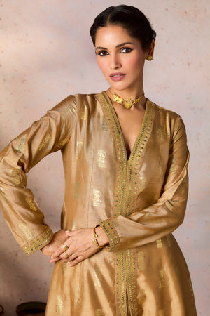 Details: Tunic- Foil printed asymmetrical tunic | Adorned with embroidered borders around neckline and sleeves | 'V' neckine | Full Sleeves | Side seam closure Pant- Beige straight pants | Side seam closure