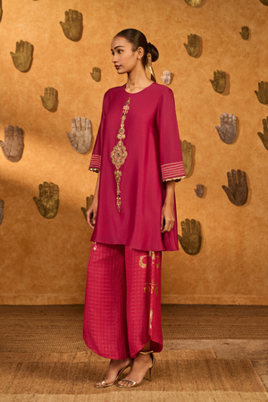 Details: A refined raspberry kurta featuring a closed neckline and quarter sleeves, accentuated with gota detailing and coin embellishments at the sleeve hems. The front middle is adorned with intricate hand embroidery, adding a touch of artisanal charm. It is paired with zari checks pants showcasing a wishdrop foil print, finished with a subtly asymmetric hemline for a contemporary edge.