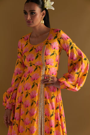 Details: Digital printed kurta dress | Layered hemline | Embellished with border and edged with kinari | Balloon sleeves