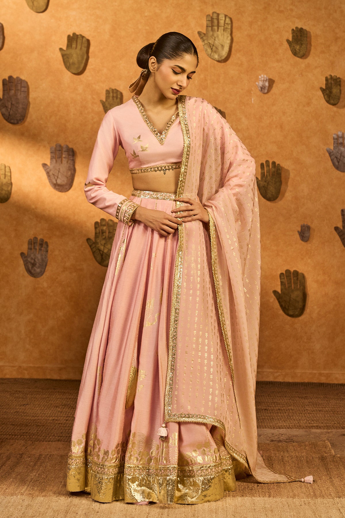 Styling: Pair the lehenga with statement jewellery and comfortable heels for an elevated look. Style it with our beautiful foil printed organza dupatta draped elegantly over one shoulder for a more elevated look. Accessorize with a beautiful potli bag.