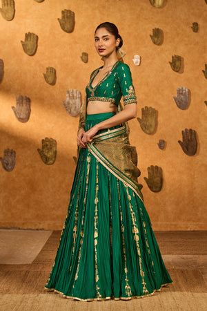 Details: This green crushed lehenga comes with an attached cancan for a graceful flare, featuring totem line foil prints repeated horizontally across the skirt and finished with a delicate gota detail at the hem. It has a side zip closure for ease and comfort. The hand-embroidered blouse is playfully accented with little pot foil print, adding charm to the look. Completing the set is a crushed Banarasi tissue dupatta, edged with a shimmer fish-print border and gota detailing, catching the light beautifully with every movement.
