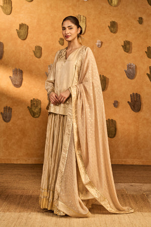 Details: Kurta- Straight kurta with Mandarin Sky Placement foil print | V- neckine and flared sleeves adorned with gold gota and foil printed borders | This kurta is embellished with the patchwork of beauitiful foil printed borders and gota. Skirt- Foil printed A- line crushed skirt | Side seam opening | Embellished with gold gota work at the hem Dupatta- Printed organza dupatta | Embellished with kinari gota and foil printed borders
