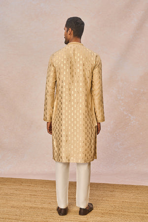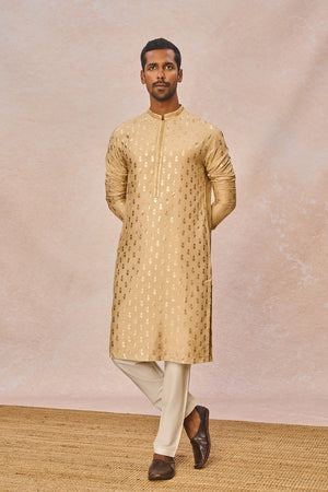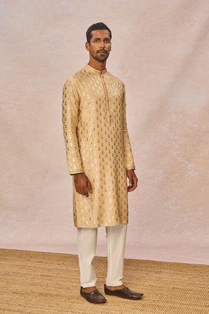 Details: Kurta- All over foil printed kurta | Full sleeves | Mandarin collar | Pocket detail | Concealed placket with gold embroidery Pant- Straight pants with pocket