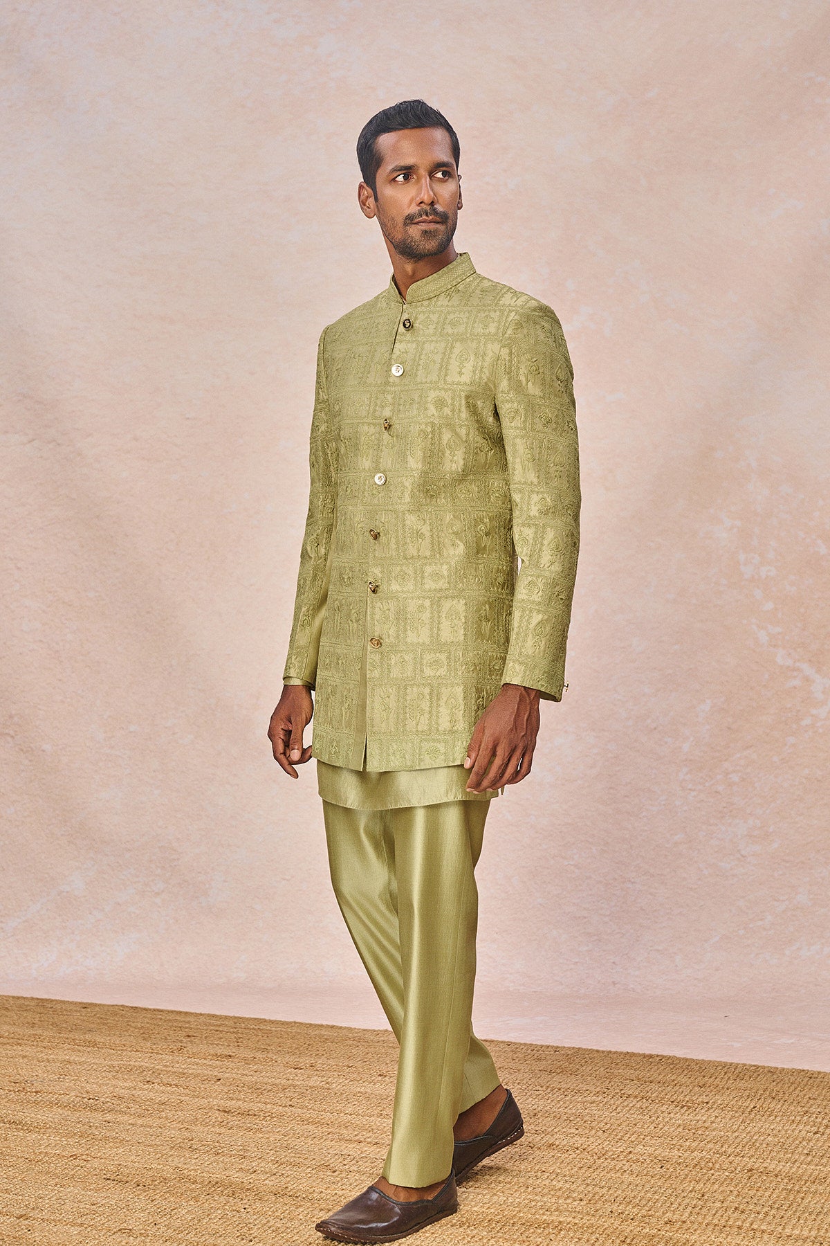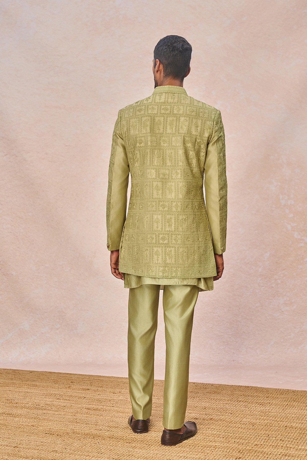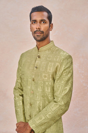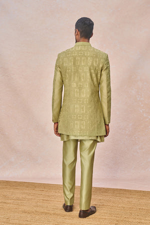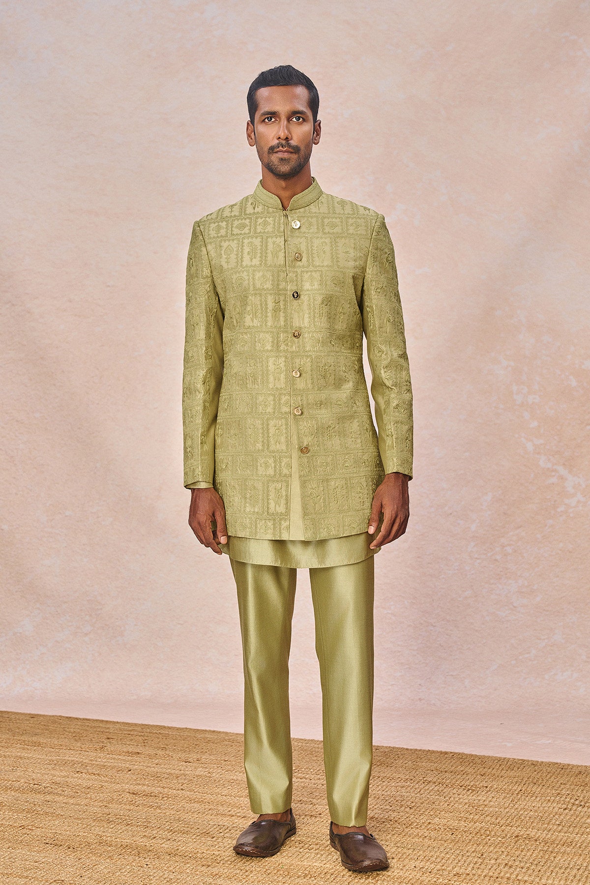 Description: ‘JAISE KOI SAPNA’ Sherwani set exudes modern sophistication with machine-embroidered ' Paankh Bagh' and 'Kolar Mocha' motifs arranged in a unique stamp-like pattern, adding texture and visual intrigue to the refined silhouette. Crafted from lustrous silk, the bandhgala balances contemporary design with traditional elegance. Paired with a matching kurta and tailored pants, this ensemble offers a polished and versatile look, perfect for weddings, receptions, or formal celebrations.