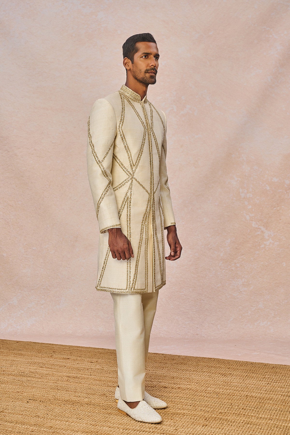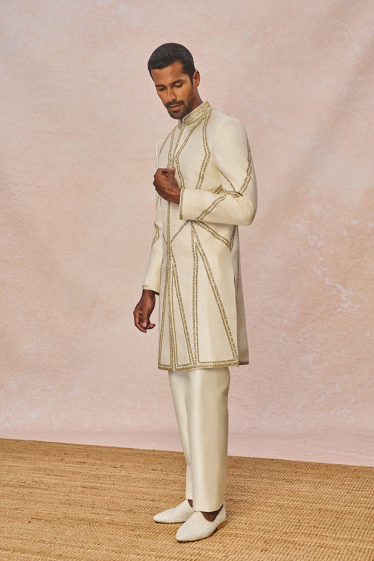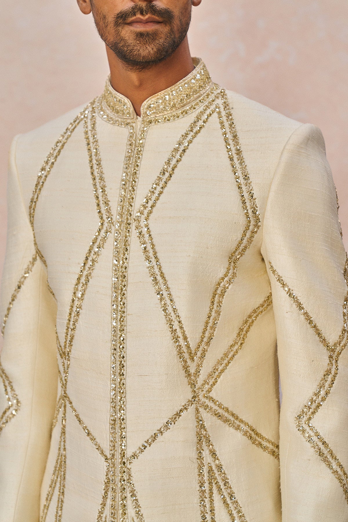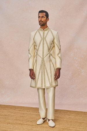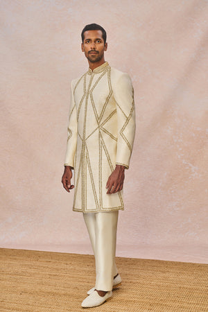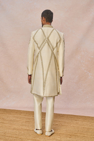 Description: The ‘NAMKEEN’ SHERWANI SET features structured 'Gul Jharokha' and 'Bagh - E - Noor' motifs adorned with intricate moti work, shimmering sitara kaam and delicate cut dana detailing. Each element is meticulously placed to form a harmonious pattern, creating an embroidery of lines that adds depth and dimension to the ensemble. Set against a soft ivory base, the gold embellishments radiate understated opulence, making this sherwani a perfect choice for weddings and grand celebrations. Paired with a matching kurta and tailored pants, it blends traditional craftsmanship with modern elegance.