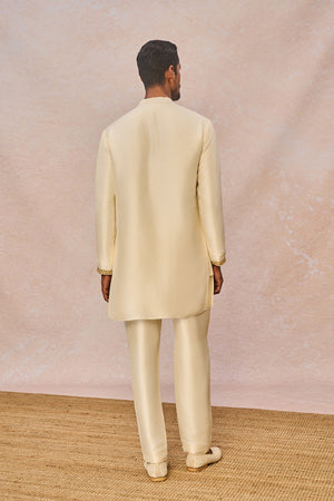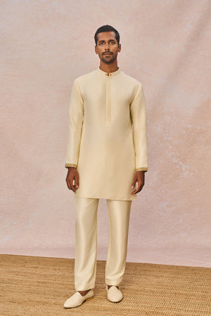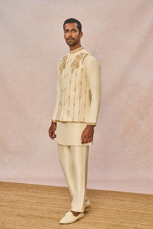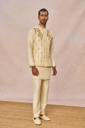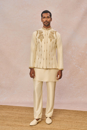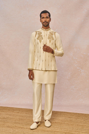 Description: ‘PEHLI KIRAN’ Bandi set is an elegant three-piece menswear set that blends traditional craftsmanship with contemporary tailoring. The bandi is embellished with our signature Kolar Mocha motifs, intricately rendered in gold sitara, dori, and moti work, and finished with an embroidered collar and a classic center closure. The silk kurta features subtle embroidery along the sleeve hems and delicate hand charms at the collar, adding a touch of whimsy and detail. It is paired with tailored silk pants, complete with functional pockets—making this look perfect for modern celebrations rooted in heritage.