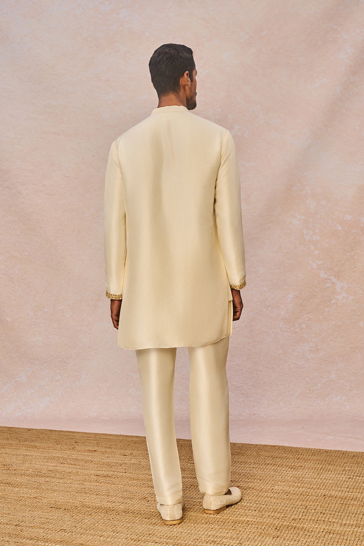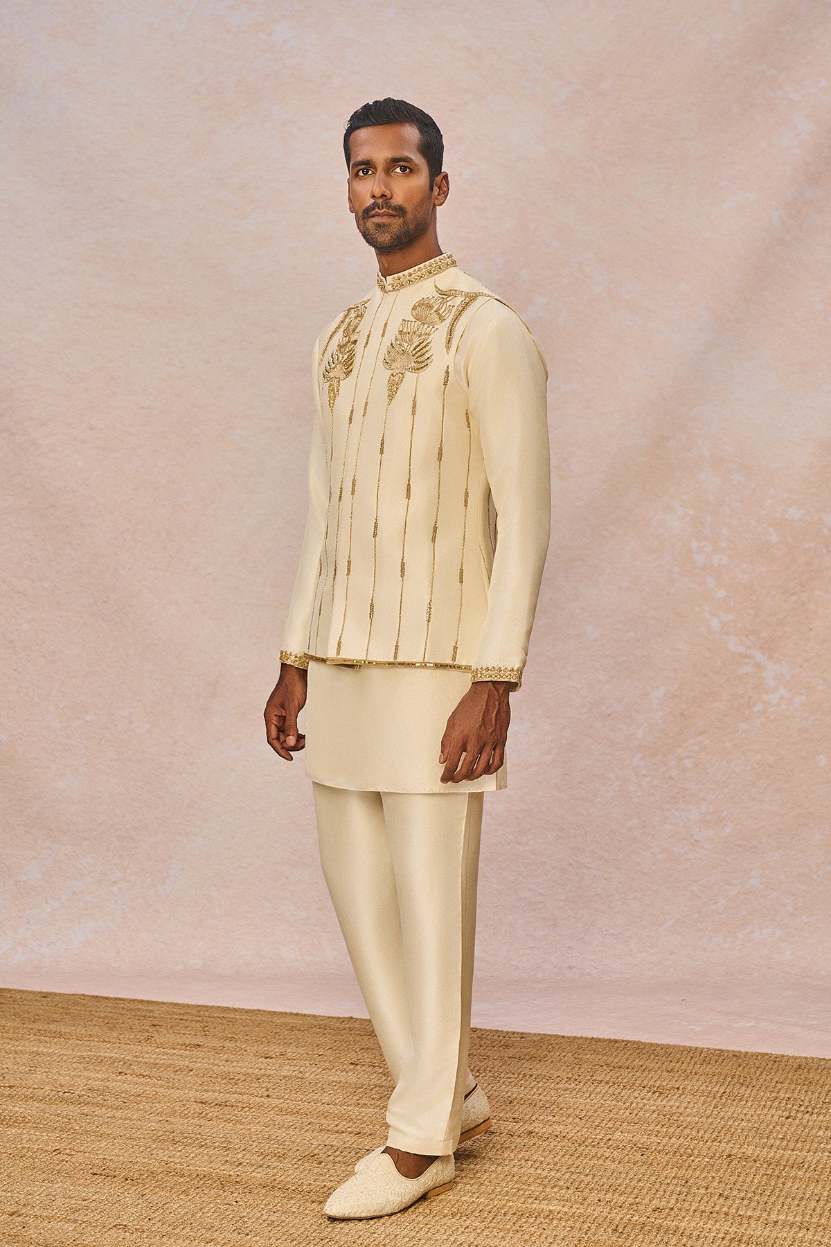 Details: Bandi – Embellished with 'Kolar Mocha' motifs in gold sitara, dori, and moti work | Embroidered collar | Center closure Kurta – Silk base | Embroidery on and sleeve hem | Hand charms on collar Pants – Tailored silk pants | Pockets