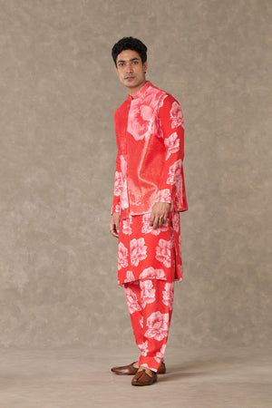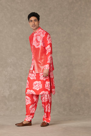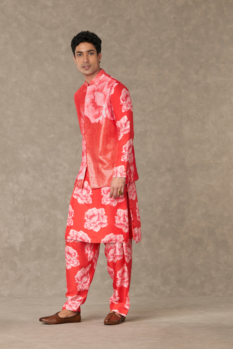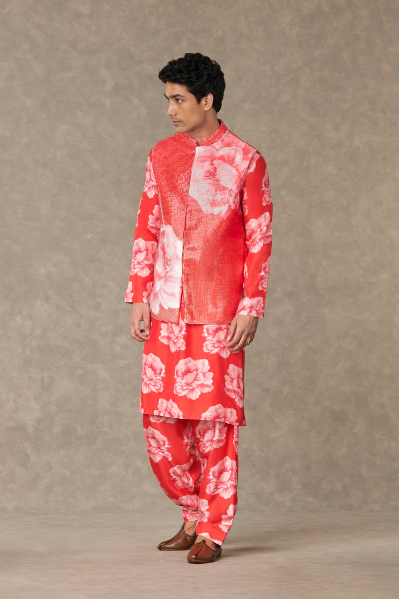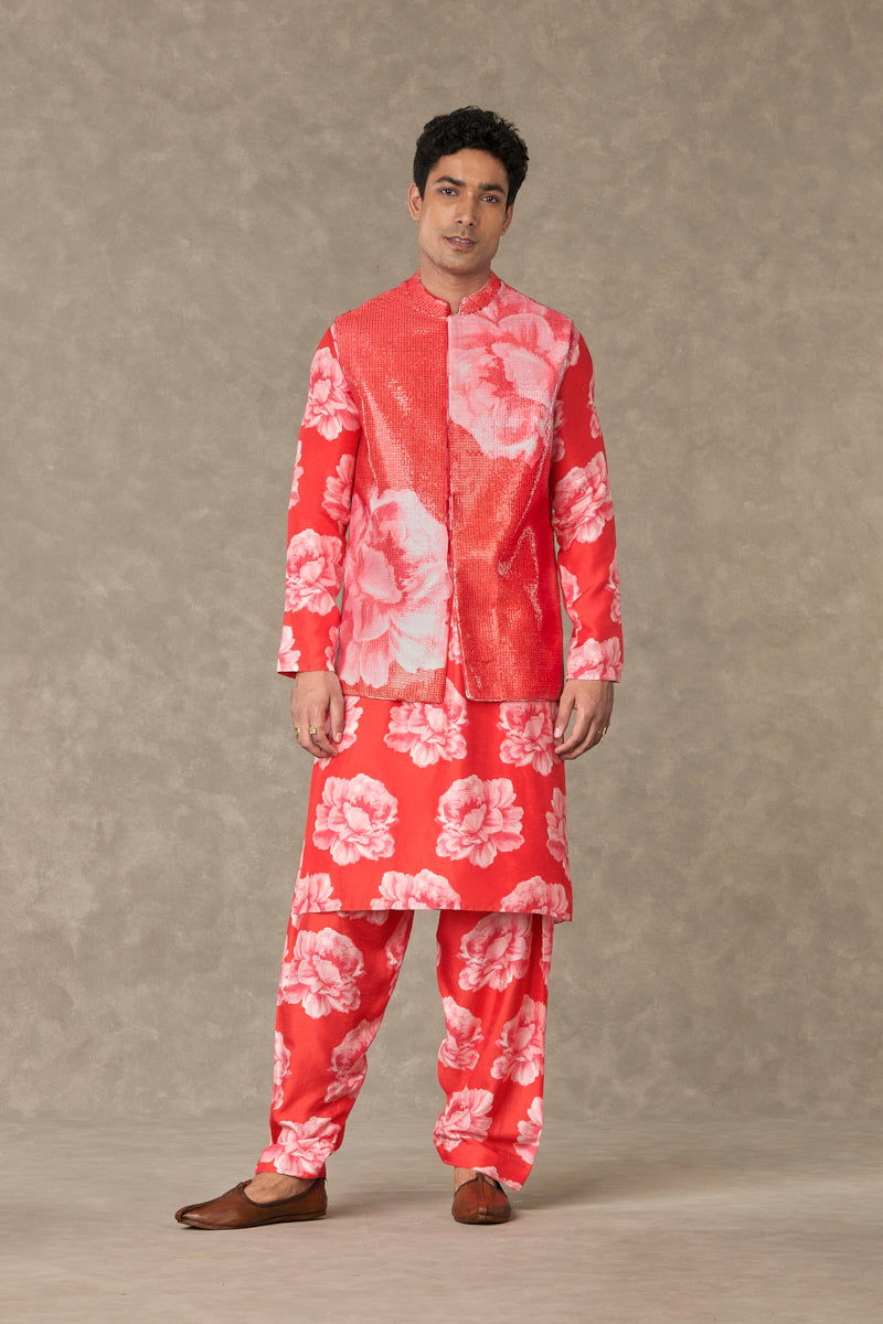 Details: Red Nurvi Sitara Set - Digital placement printed bandi with full sleeves| Mandarin collar | Concealed placket |Center front opening Kurta- All over digital printed kurta | Full sleeves | Mandarin collar | Concealed placket | Pocket detail Salwar- All over digital printed salwar with elasticated waist