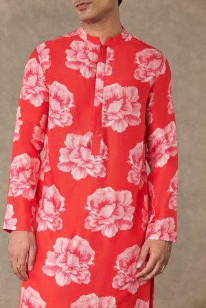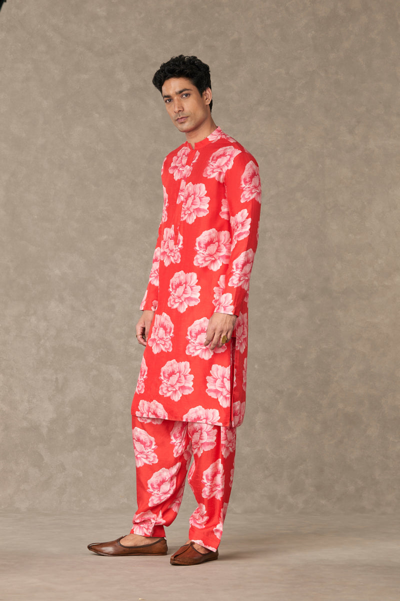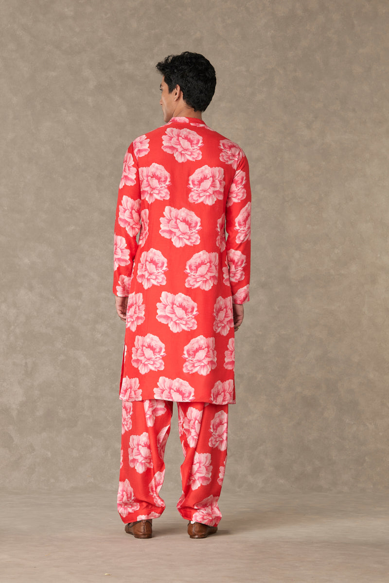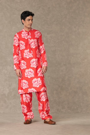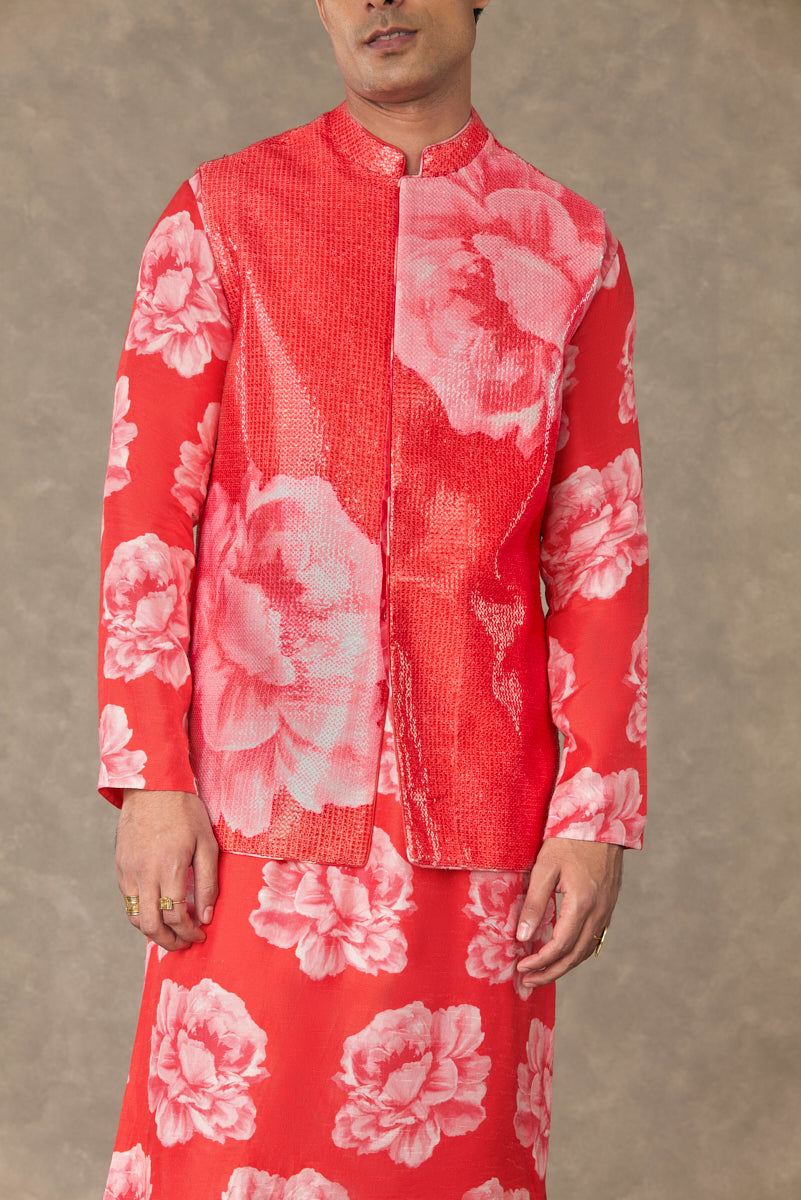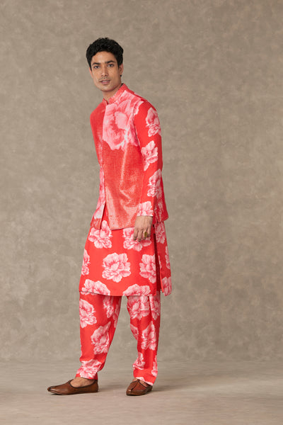 Details: Red Nurvi Sitara Set - Digital placement printed bandi with full sleeves| Mandarin collar | Concealed placket |Center front opening Kurta- All over digital printed kurta | Full sleeves | Mandarin collar | Concealed placket | Pocket detail Salwar- All over digital printed salwar with elasticated waist