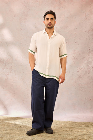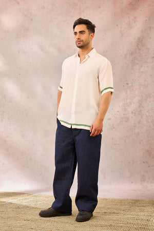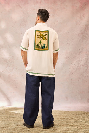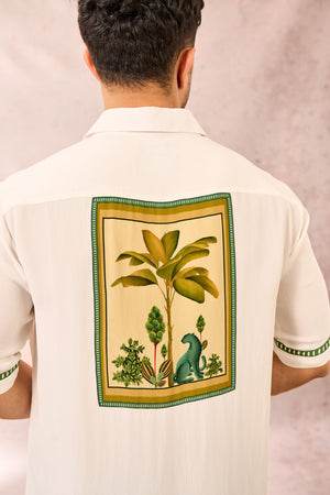 Details: Shirt- Shirt with digital print patch at the back | Standcollar | Front placket | Hem and sleeves are adorned with printed border | Gold Toffee button attached to the side seam