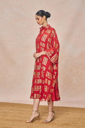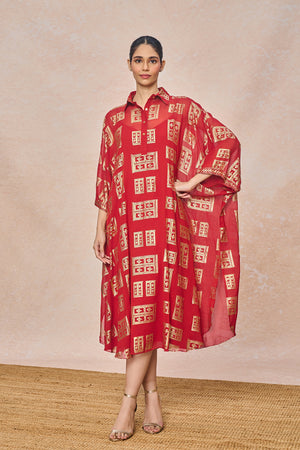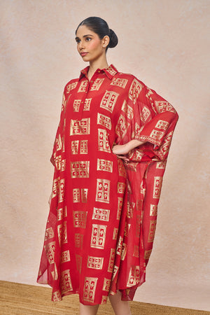 Details: Red Open Doors Foil Collar Kaftan - Kaftan with slip | Shirt collar with placket | Batwing kaftan | Midi length