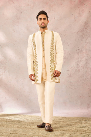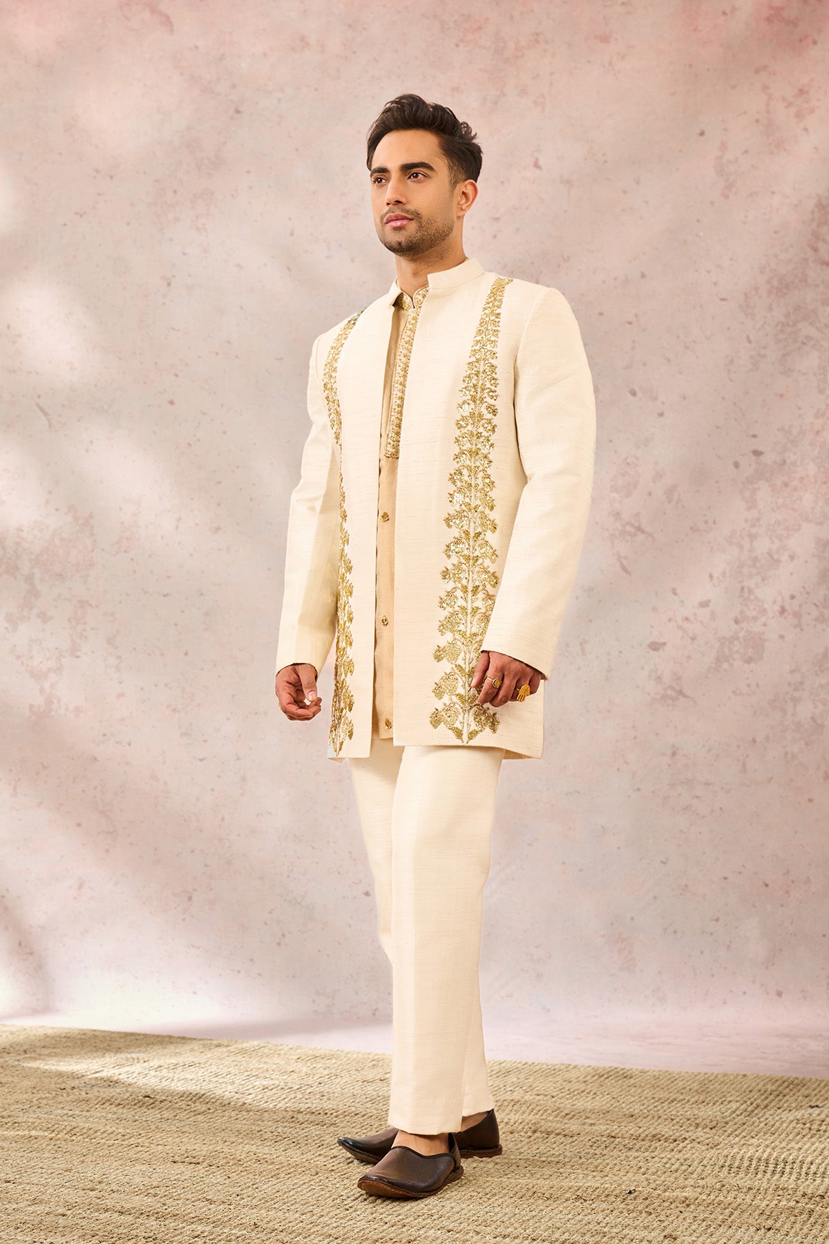 Details: Koti - Embellished with 'Berry Bel' motif in gold dori, sequins and cutdana embroidery | Full sleeves | Open Sherwani | Printed lining | Short length Pant - Front button and zip opening | Pockets Kurta - Embellished kurta with 'Berry Bel' motif in gold dori, sequins and cutdana embroidery| Embellished placket & collar