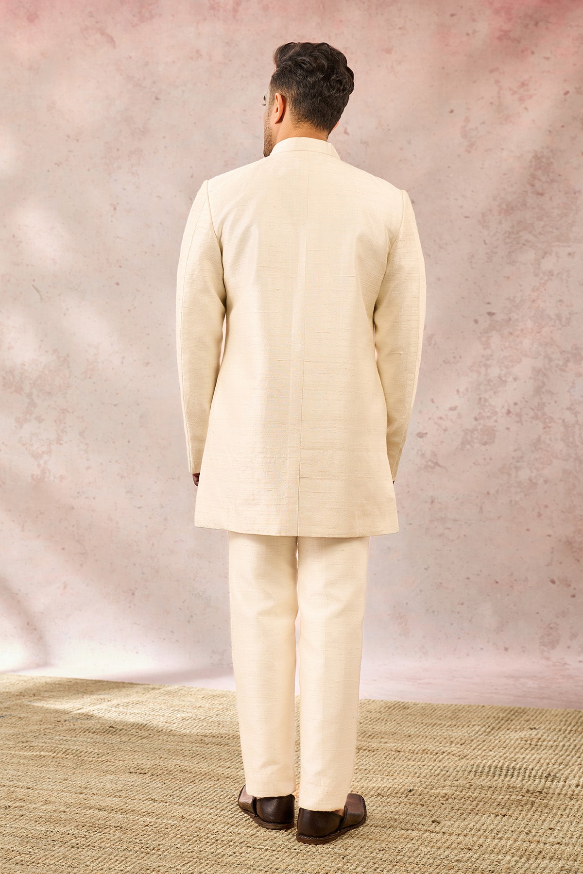 Description:The Kaju Katli Raja koti is an ornate ensemble, embelished with heavy gold embroidery of zardozi, katdana and pearl work inspired by 'Berry Bel'. This sherwani consists of a short georgette tissue kurta inside to add whimsy to the whole look and a pair of straight smart pants.