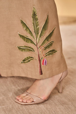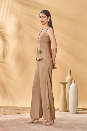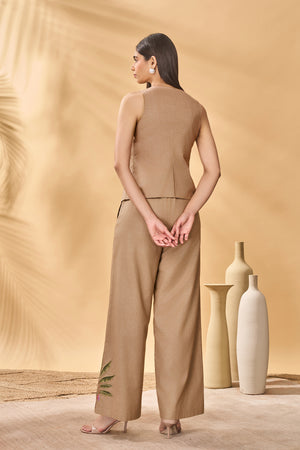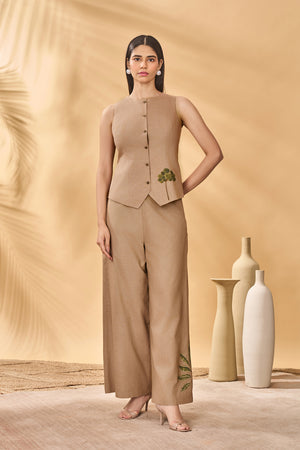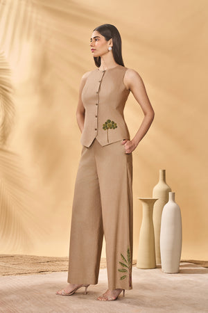 Details: Waistcoat- Round neck | Centre front button closure | Trellis Palm Patchwork on the front Straight fit trousers | Trellis Palm Patchwork on one side of the bifurcate |Side seam zipper closure | Side seam pockets