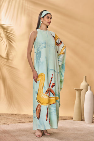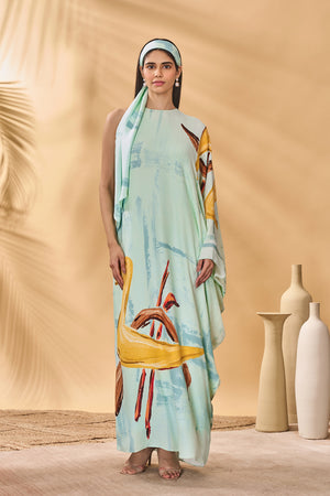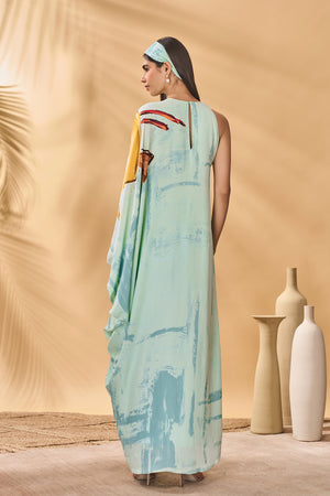 Details: Asymmetrical | Halter neck with one shoulder sleeve | Blue Feathered placement on body