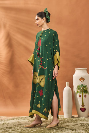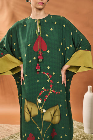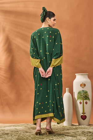 Details: Kaftan- Green clover checks kaftan adorned with patchwork on sleeve | Asymmetrical hemline | Tie-up detailing
