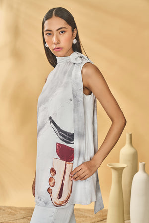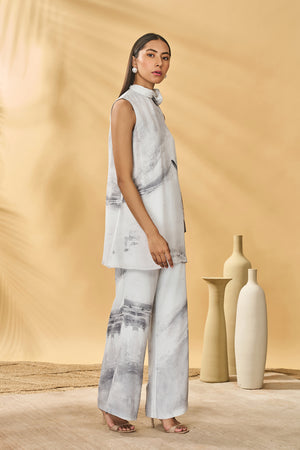 Details: Tunic- A line | Bow tie- up on neck | Moon & Mist placement print on body Pants- Flared bell bottom pants | Side pocket |Elastic at the back | Side zipper closure