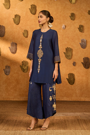 Details: A refined Sapphire kurta featuring a closed neckline and quarter sleeves, accentuated with gota detailing and coin embellishments at the sleeve hems. The front middle is adorned with intricate hand embroidery, adding a touch of artisanal charm. It is paired with zari checks pants showcasing a wishdrop foil print, finished with a subtly asymmetric hemline for a contemporary edge.