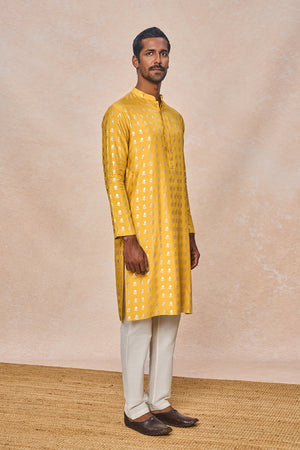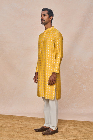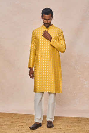 Styling: Pair Mustard Color Kurta Set for Men with a pair of mojris.