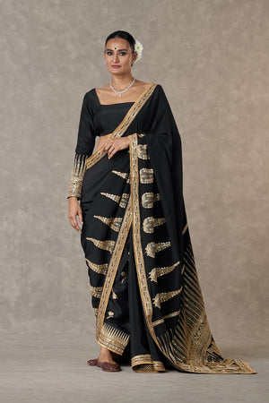 Details: Black Son-Patti Saree - Palla intricately embroidered with signature motifs - Son-Patti, Son-Chidiya & Trikone in dori and sitara kaam |Embellished with embroidered borders | Printed backing Blouse piece - Trikone embroidered blouse piece Salwar - Gold foil printed patiala salwar with ornate borders at the hem | Centre back closure