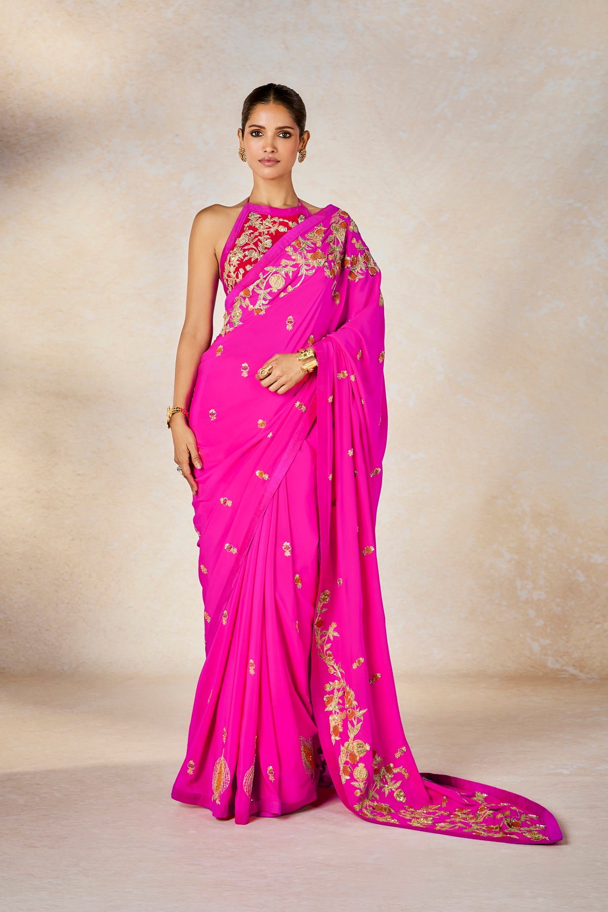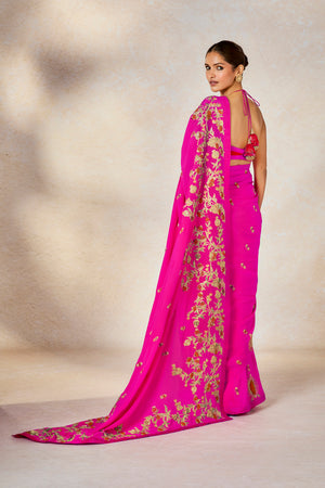 Description:Our iconic hot pink comes to life in a whimsical expression in The Dilli 6 saree. Inspired by the bustling cultural streets of purani Dilli, where expression and heritage is brewed, this saree is a manifestation of those very streets. Brimming with the Anar bagh jaal through the pallu in starry gold, and scattered with colorful threadwork and beadwork .