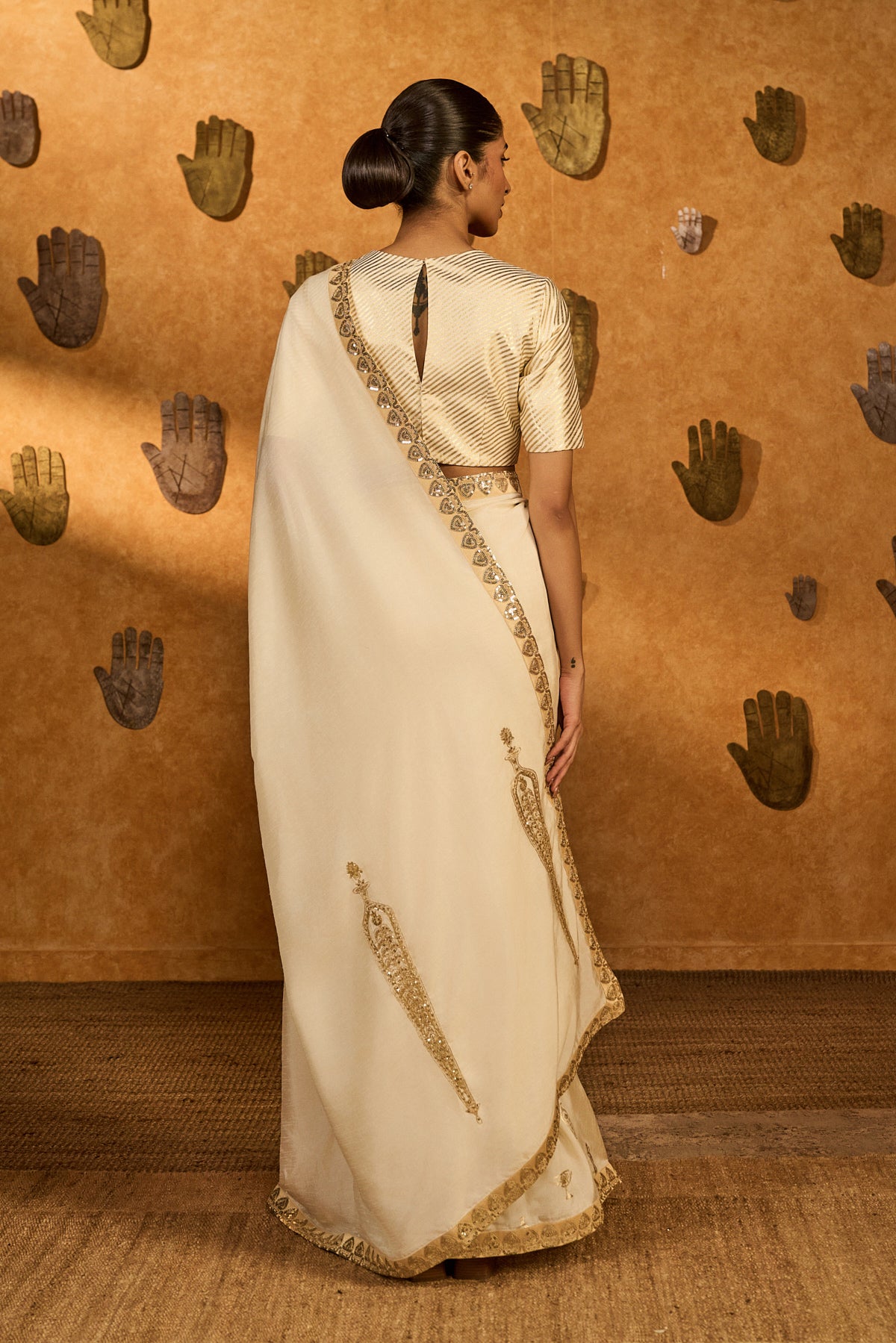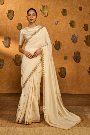 Details: Saree - Embellished with embroidered borders | Embroidered motif on palla with potter's touch foil on pleat area