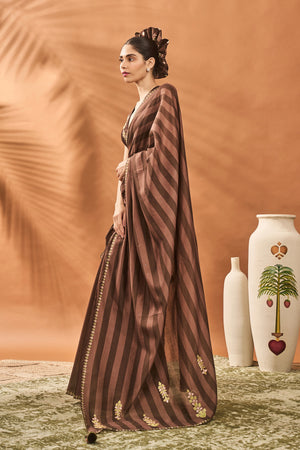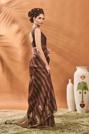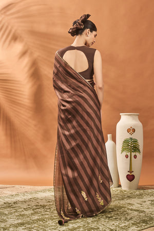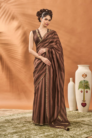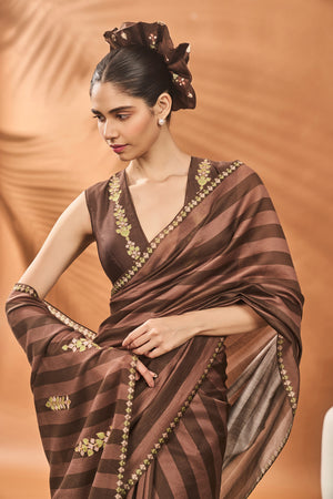 Details: Saree- Beautiful all over printed saree with Mocha Mosaic print | Palla is embellished with beautiful embroidery motifs | Adorned with beautiful tassles Blouse piece- Blouse adorned beautiful with resham embroidery and tassles