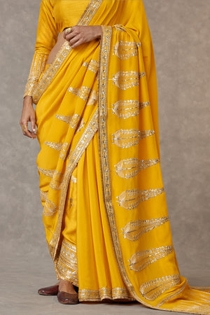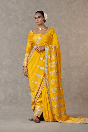 Details: Yellow Patti Saree - Palla intricately embroidered with signature motifs - Son-Patti, Son-Chidiya & Trikone in dori and sitara kaam | Embellished with embroidered borders | Printed backing