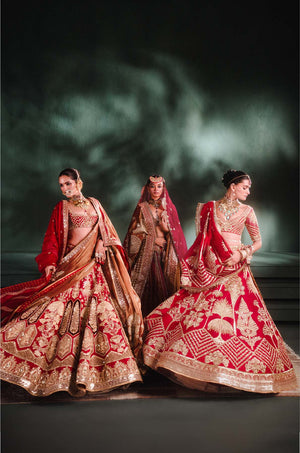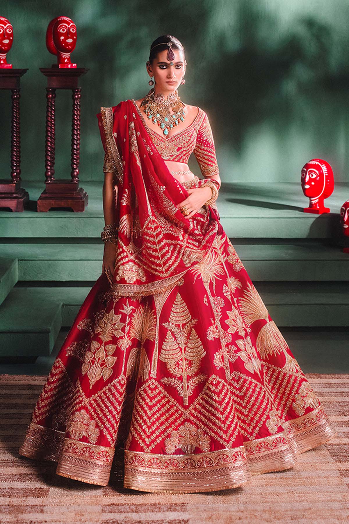 Description:Adorned in the age old craft of hand embroidery done over several hours by skilled artisans, The Aalu Bukhara lehenga embodies the free spirited bride. House motifs like the Jharna, Son Parni and Amaltas are brought to life in Dabka, moti and dori kaam. Paired with an ornate blouse that brings together the whole look with the help of a dupatta and heavily embroidered veil. Comes with a separate cancan.