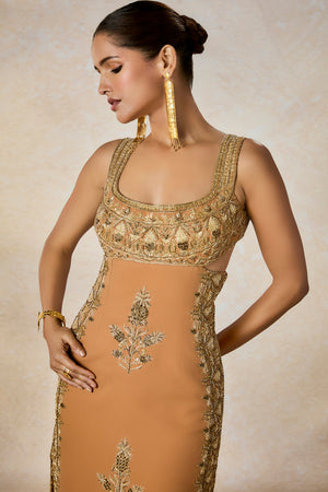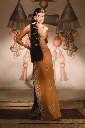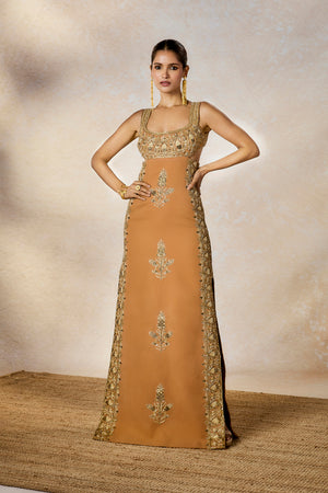 Description:Our 'Baug Taj' motif takes center stage in The Mishti Doi gown. Cascading down the center of the ensemble and surrounded by sunheri bel curving to create a beautiful symphony of motifs. With an elegant silhouette and cutout details in a harmonious bond, the Mishti Doi Gown is perfect for soirees.
