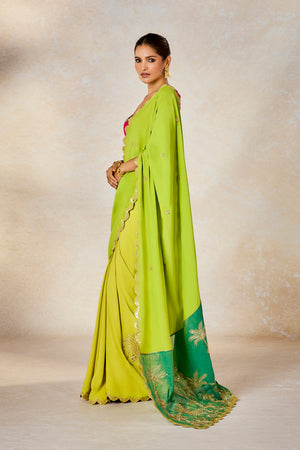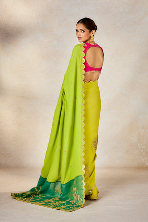 Description:The Meetha Paan saree is a vision in crepe that sways in the richness of tradition. Color blocked in hues of green consisting of a melange of motifs like the Sehra and Nirjara Pushp embroidered in gold on the pallu as well as the pleats. Paired with a scoop neck choli, embellished heavily with our Raj Pankh motif, this saree is a unique addition to any trousseau.