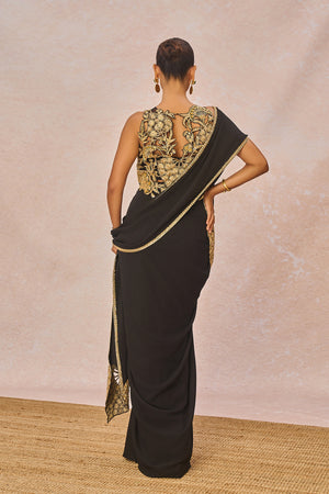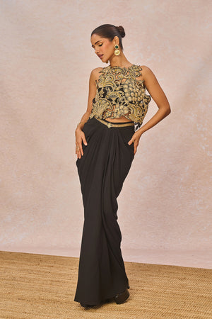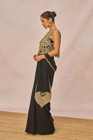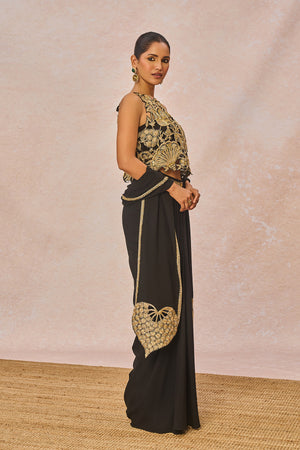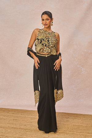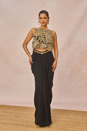Description: ‘AJNABI EHSAAS’ fusion set is a striking four-piece set is a celebration of craft and detail. The ensemble features a tulle cutwork top adorned with our signature Paankh Bagh motifs creating a jaal and a delicate back closure. It is paired with a front-pleated draped skirt, elevated by an embroidered waistband, back opening, and a thoughtfully placed printed lining. The look is completed with a tube-style bustier featuring a printed facing, and a matching stole with cutwork Paan Phool motifs at both ends, finished with a printed edge. A perfect blend of modern silhouette and intricate craftsmanship.