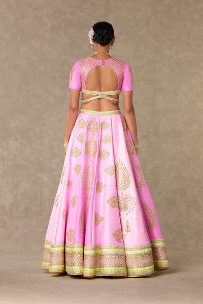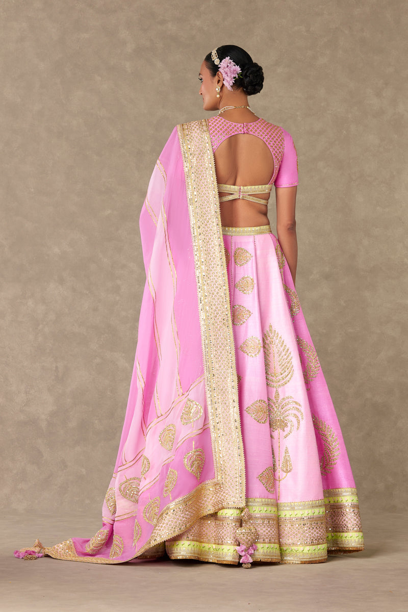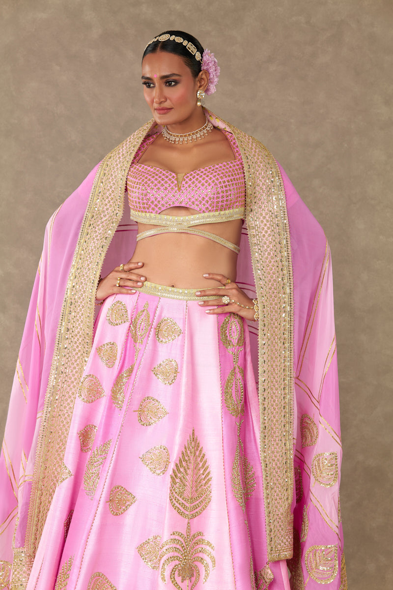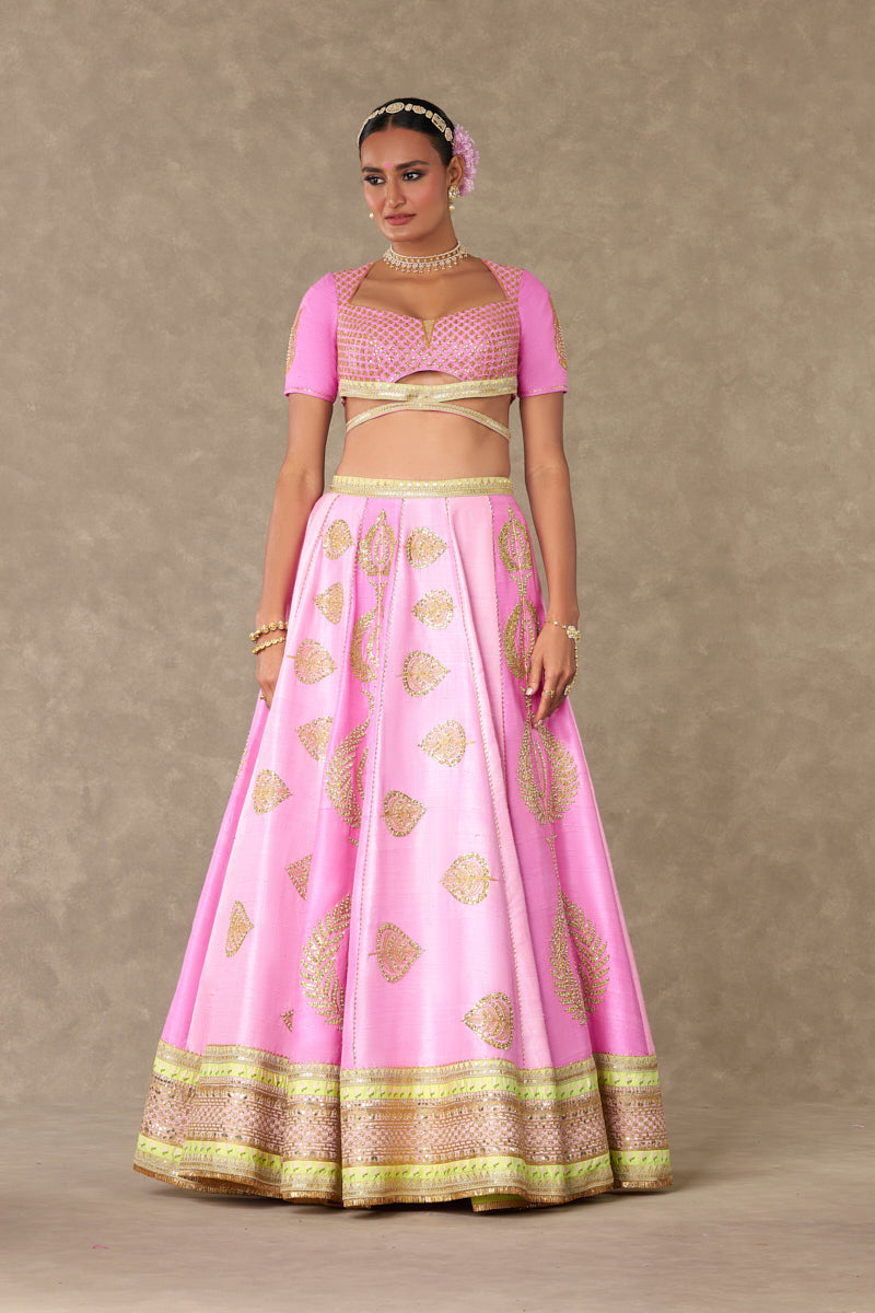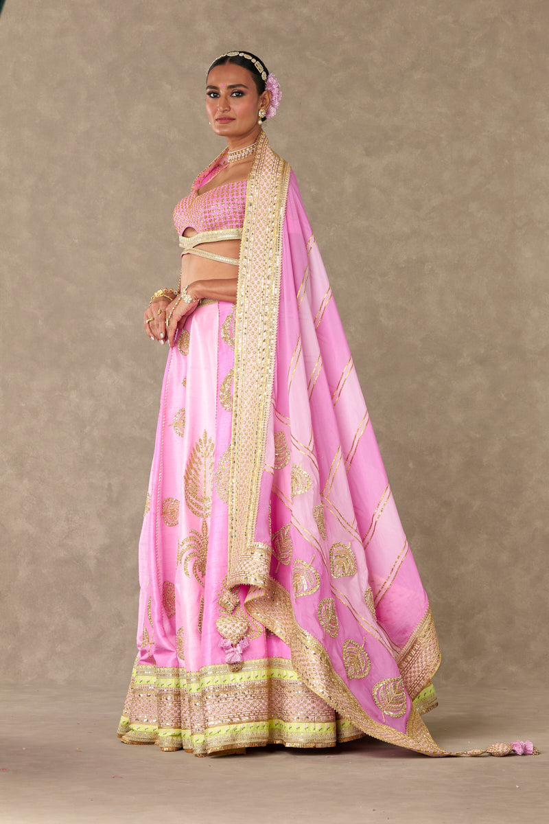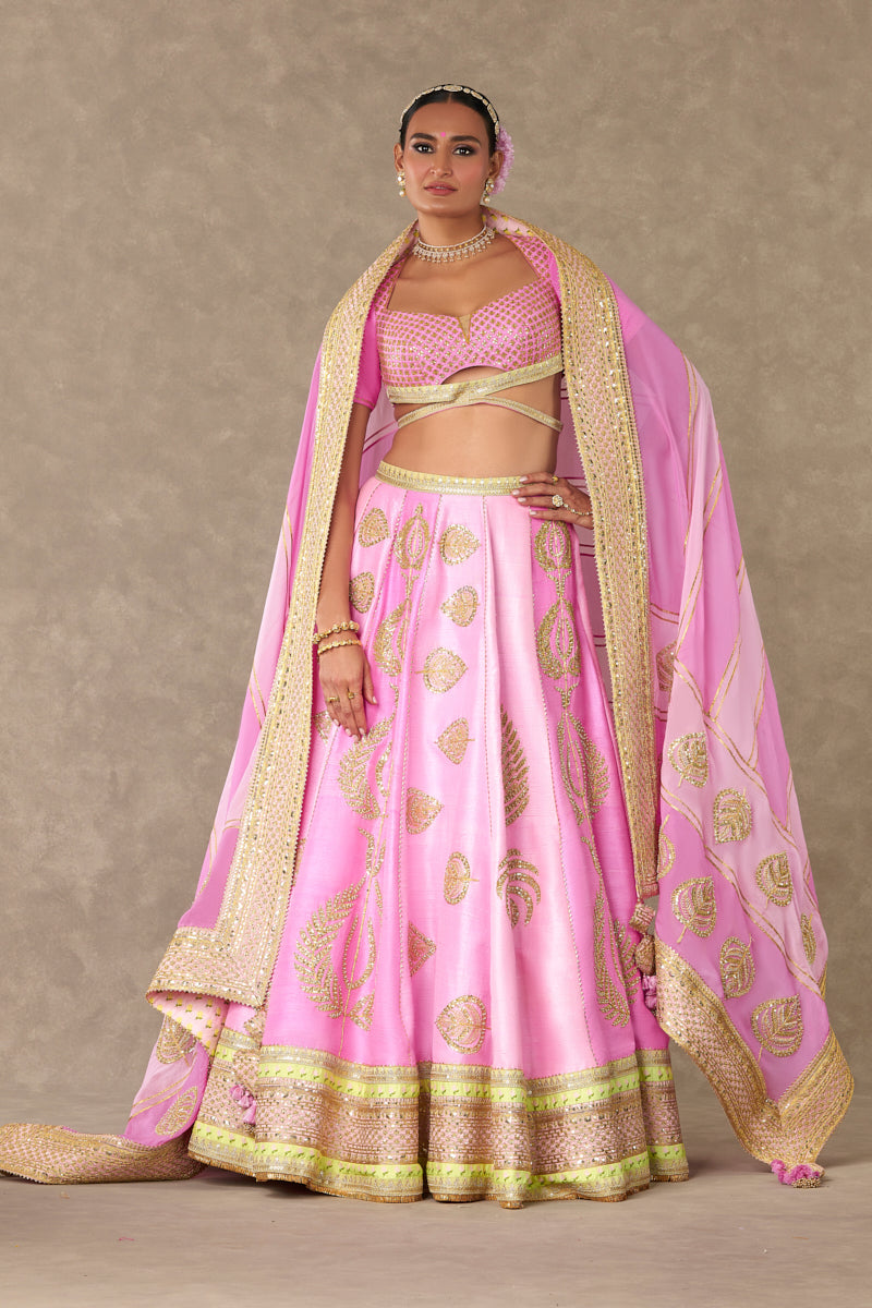Details: Barfi Pink lehenga- Lehenga comes in not one but 3 different shades of pink- Mithai Pink, Rani Pink, Gulaab Pink and is embellished with our signature Sitara- Dil motif with dori & sitara kaams | Hemline is embellished with beautiful patchwork borders and edged with jhallar | Side zip closure | Pocket detail | Comes with a separate can can skirt Blouse- Cut-out blouse adorned with Jhaali in dori and sitara kaam |Cap sleeves adorned with Haath-Phool motif in dori and sitara kaam| Sweetheart neckline | | Centre back closure Dupatta- Beautiful pink patchwork dupatta adorned with gota sila & sitara dil motif in dori and sitara kaam | Embellished with embroidered border and edged with jhallar | Tassel detail