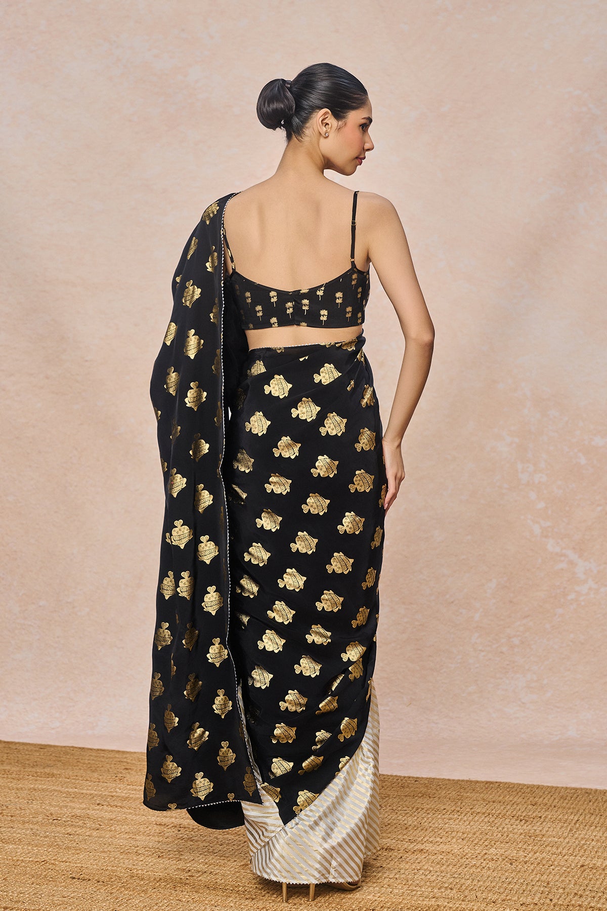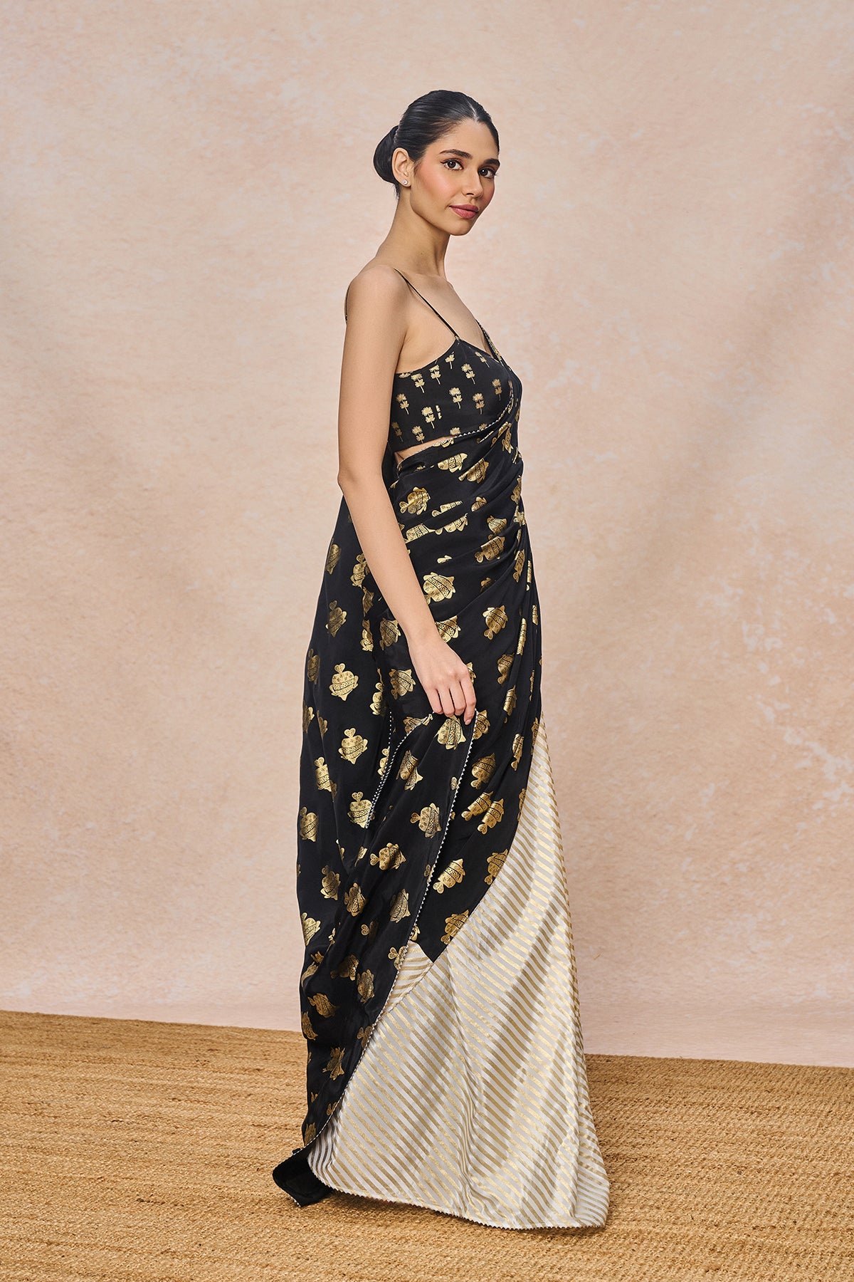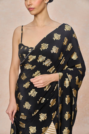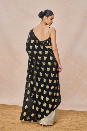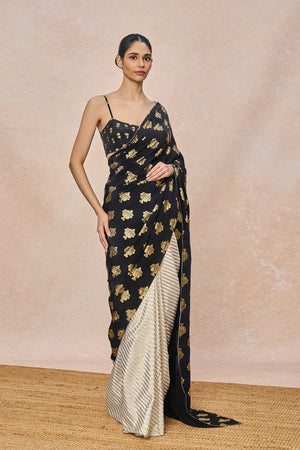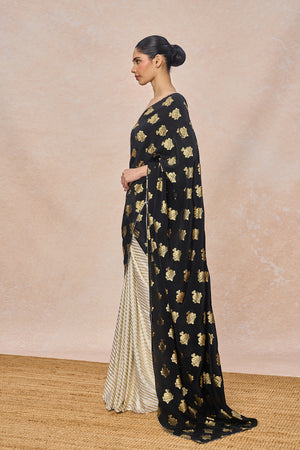 Fabric: Saree - Black Natural Crepe with Ivory Natural Crepe Gold Foil | Blouse - Natural Crepe Gold Foil
