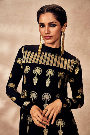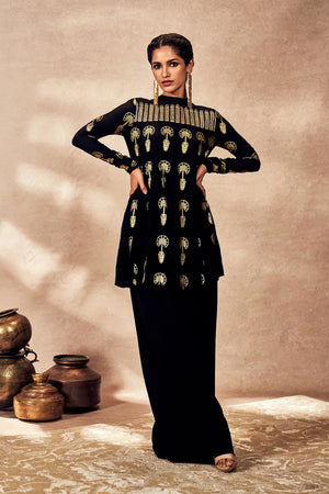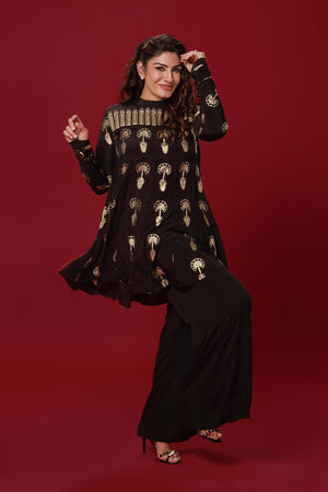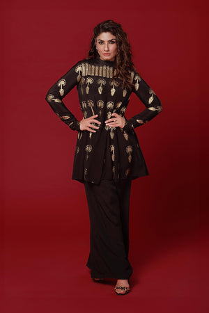 Details: Tunic- Foil printed tunic with yoke | A- line | Yoke adorned with gold sequin and dori embroidery | Full Sleeves | Center back closure Pant- Black straight pants | Side seam closure