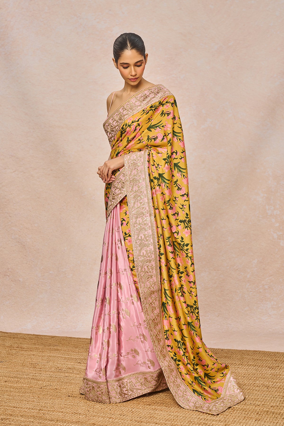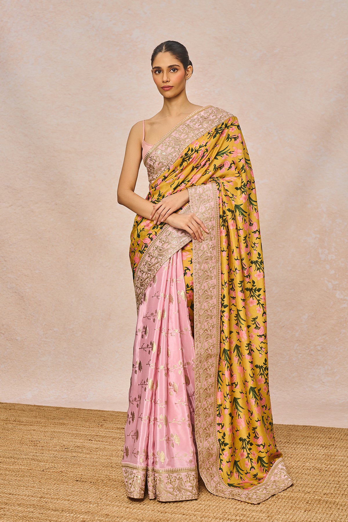 Fabric: Saree - Raw Silk Digital Print with Natural Crepe Gold Foil | Blouse - Raw Silk