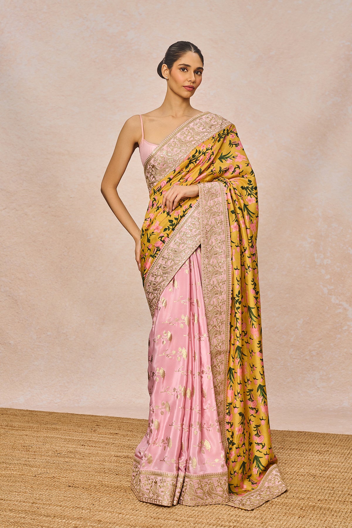 Details: Saree- Mustard Floral Bloom Saree is an all-over printed saree with mustard digital print paired with a raw silk blouse.