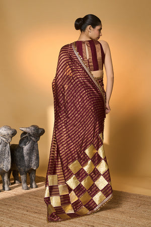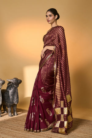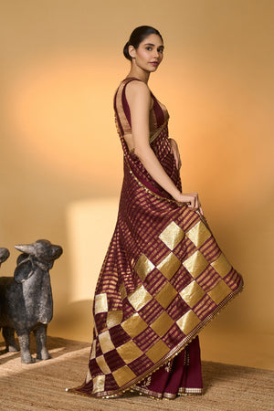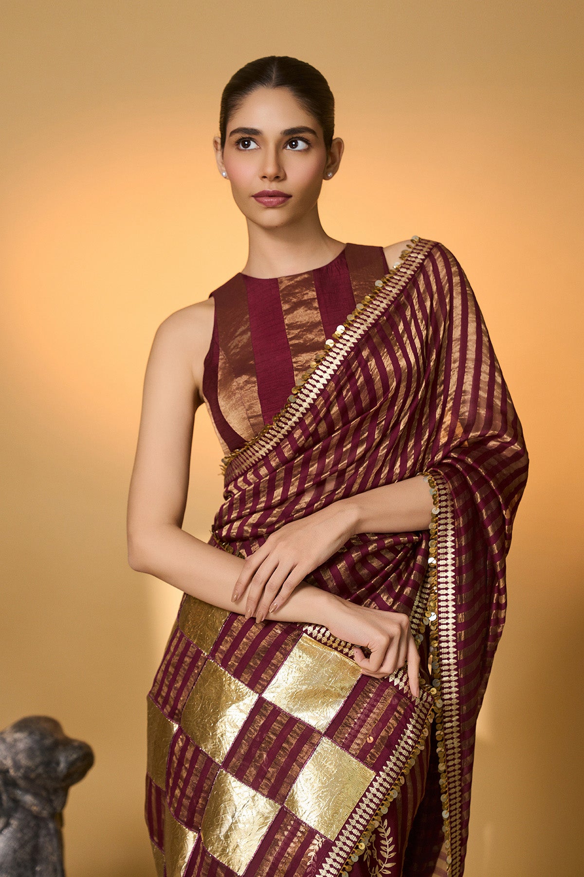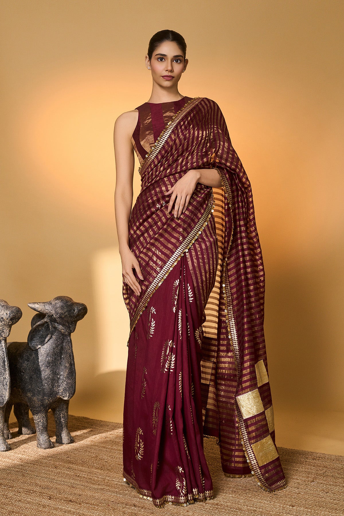 Details: A traditional saree featuring raw silk pleats adorned with foil work all over for a rich textured look. The pallu is crafted in zari stripe tissue, highlighted with lumpi gota embroidered in alternate box patterns. A finely detailed border enhances the elegance of the drape and adds structure to the design. The blouse is designed in a mix of tissue and raw silk, creating a balanced blend of textures. Ideal for festive occasions and celebrations