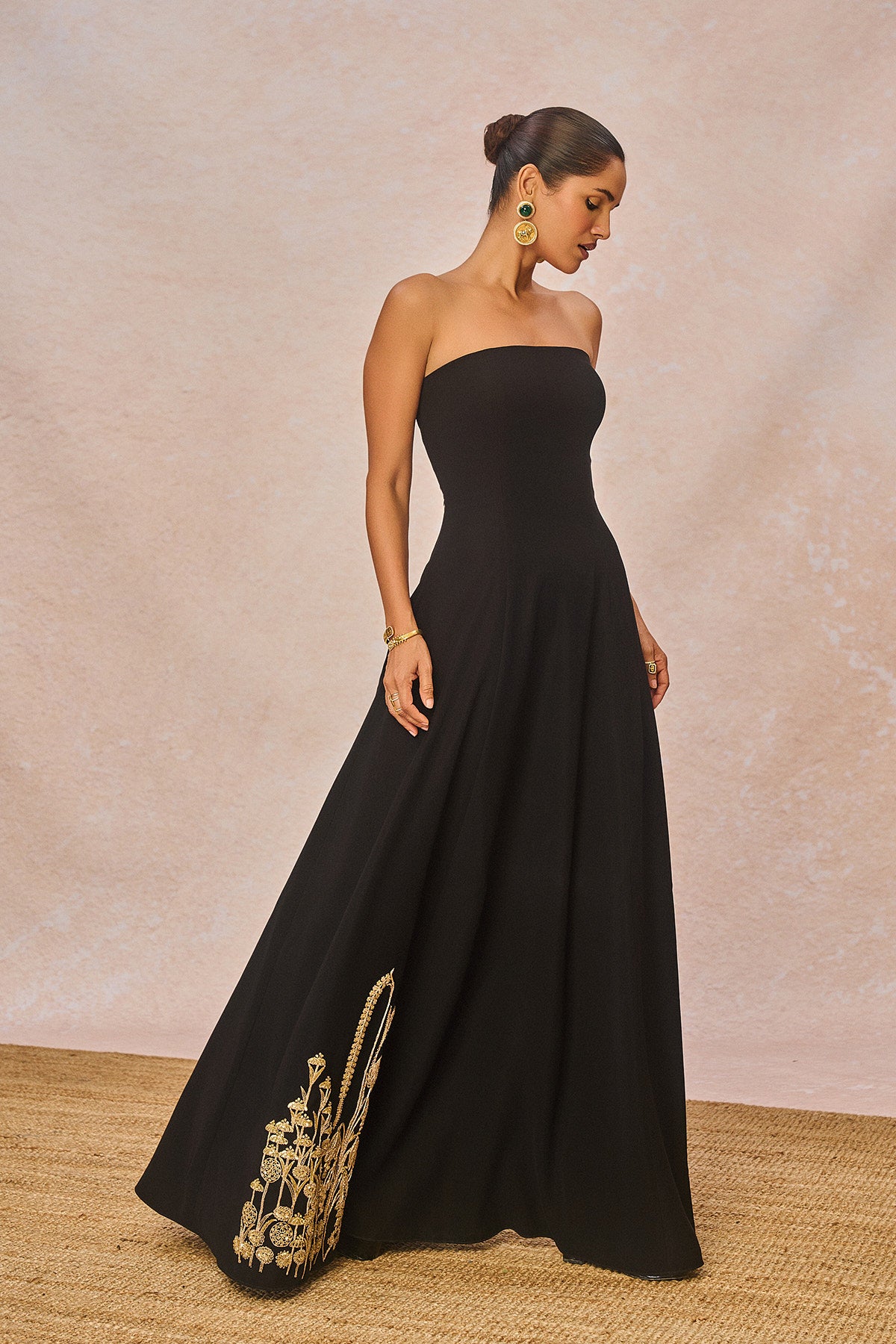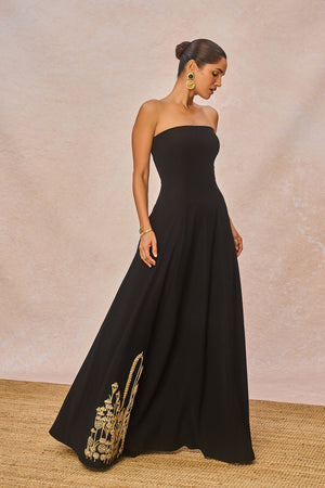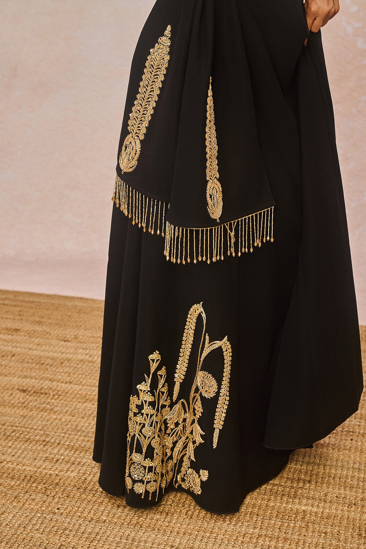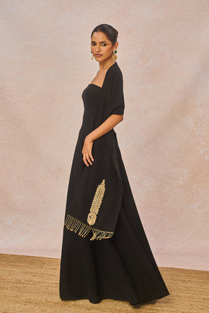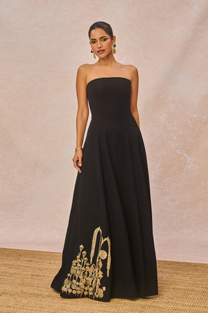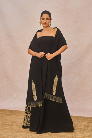 Description: ‘PYAAR KE CHARCHE’ Gown is a true celebration of intricate craftsmanship. This strapless heavy crepe gown features the majestic 'Bagh' motif at the hem, highlighted with delicate gold sitara embroidery and fine dori work. Accents of moti add a luminous touch, making the motif stand out with elegance. Completing the look is a matching stole with our 'saanjh leher' motif detailed with dori and sitara embroidery with cutdana tassels adding just the right amount of sparkle.