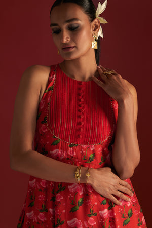 Details: Digital printed kurta dress | High- low hemline | Edged with kinari | Oval-shaped yoke with Dhagai detailing in accents of red & gold | High Neck