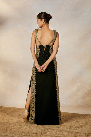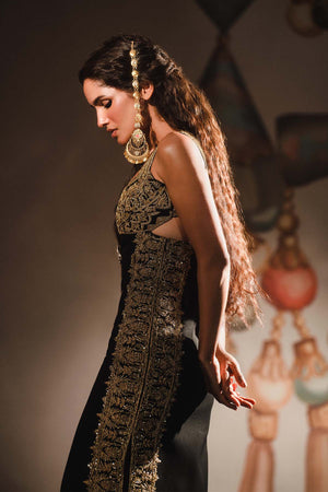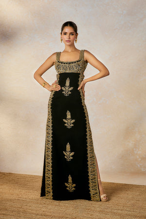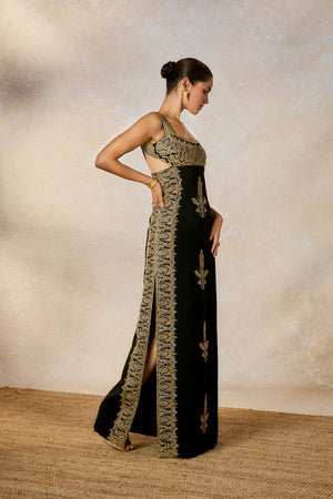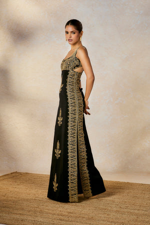 Description:Our 'Baug Taj' motif takes center stage in The Anjeer Pak gown. Cascading down the center of the ensemble and surrounded by sunheri bel curving to create a beautiful symphony of motifs. With an elegant silhouette and cutout details in a harmonious bond, the Anjeer Pak Gown is perfect for soirees.