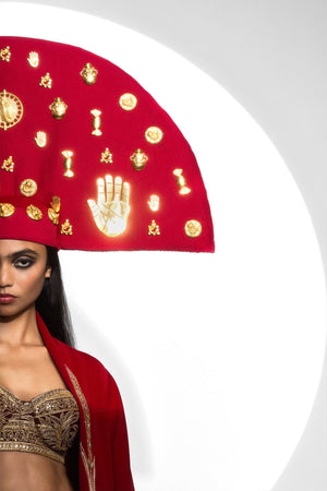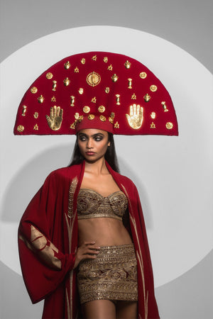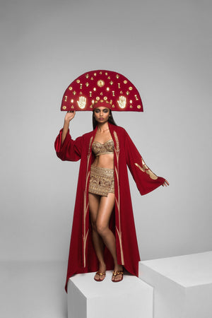 Styling: Housecoat - The Carmine Stalk of wheat embroidered Housecoat is a classy overcoat that can be paired with the India Mini and Bralette for a red carpet look or paired with The Ghana Gator corset set.
