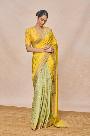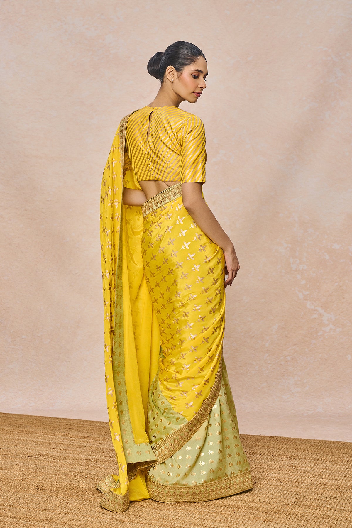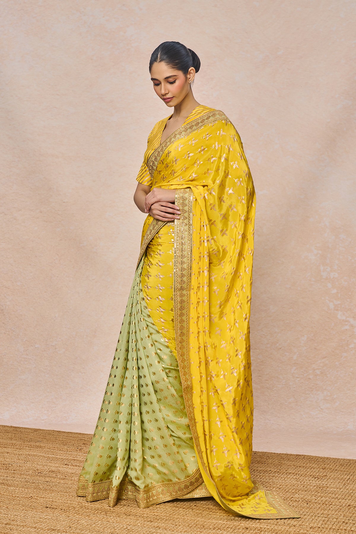 Details: Saree- Yellow Triangular flower saree is an all over foil printed saree paired with a natural crepe foil printed blouse.