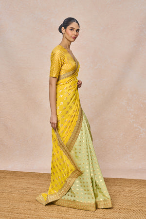 Fabric: Saree - Natural Crepe with Mint Raw Silk Gold Foil Print | Blouse - Natural Crepe