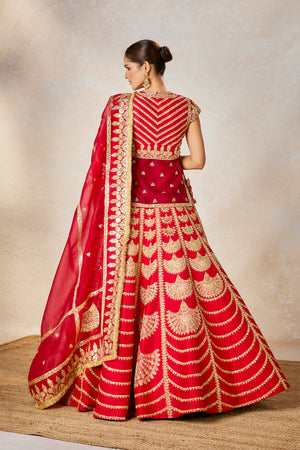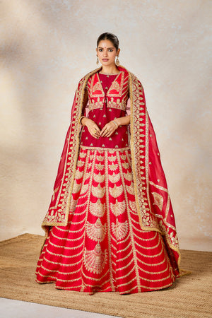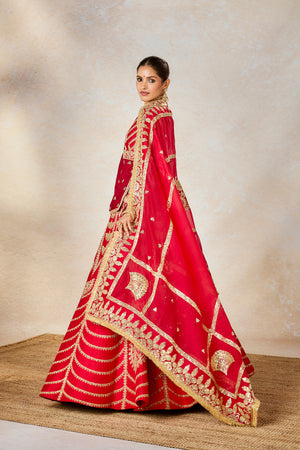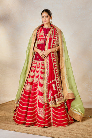 Description:Drawing inspiration from the traditional Daaman, Kurti and Chunder of Haryana and giving it a contemporary narrative, The Anar Dana lehenga defines tradition and heritage. With 6 elements in this Lehenga- the Silk Kurta with an ornate koti embroidered with our Kunji motif, the cascading Raj Pankh motif embroidered throughout the lehenga styled with an additional saree and a contrast patchwork dupatta- This is the purani dilli Masaba Bride. Comes with a separate cancan.