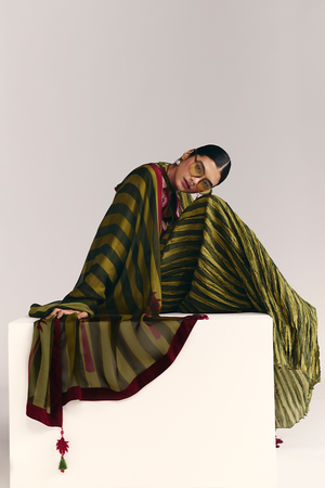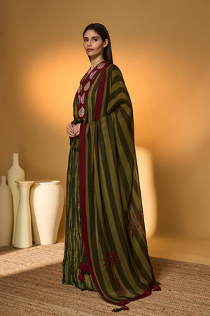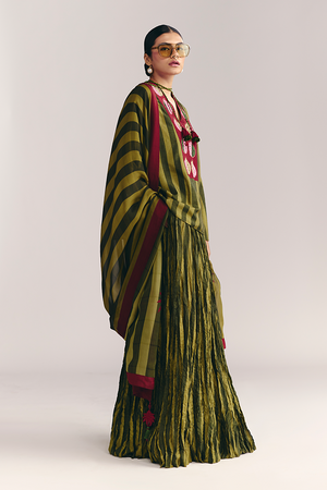 Details: Kurta Top- V-neck | Flared Body | Yoke embroidered in contrast colors | Adorned with tassel details | Bell Sleeves Skirt- Kali Skirt | Crushed Body | Side seam zipper closure | Flared Silhouette Dupatta- Sheer | Adorned with tassels | Contrast 'Tree' placement on either side