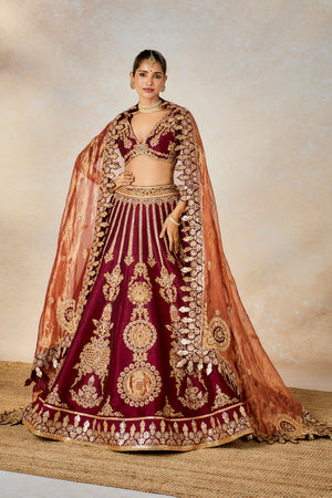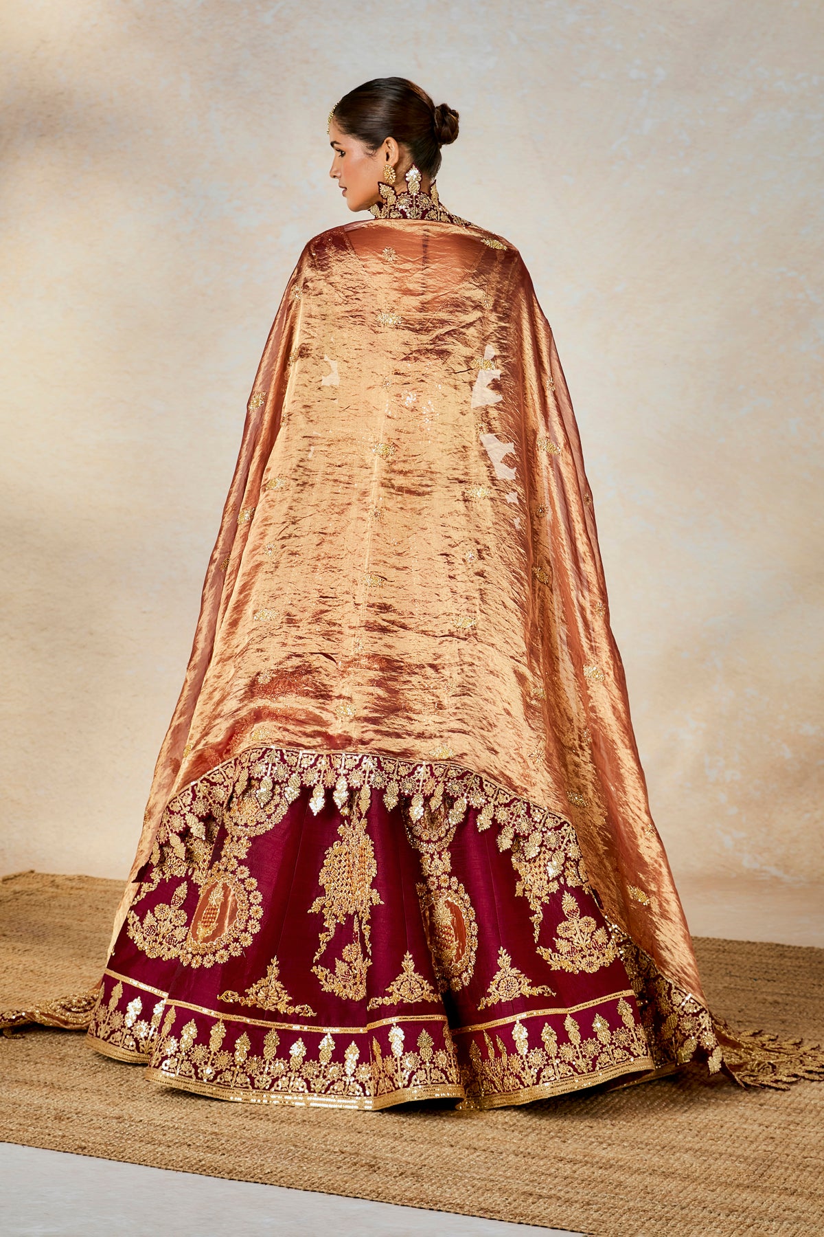 Description: The Anjeer Kalakand lehenga is an elegant bridal ensemble, featuring delicate circular tissue patches that add a refined, textured element to the lehenga. The standout detail is the intricate Baug Taj motif, a traditional floral design that exudes luxury and sophistication, embroidered with fine threads and beads to create a rich, detailed effect. The lehenga is paired with a beautifully crafted blouse that showcases scalloped sleeves, enhancing the overall elegance and giving the outfit a contemporary touch. A tissue dupatta, with delicate appliqué lace along the edges, adds further richness and completes the ensemble with its soft, ethereal feel.