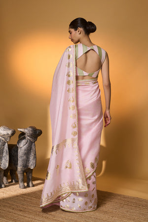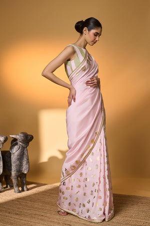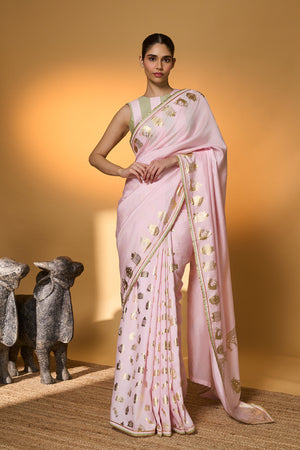 Details: Saree – The saree has all-over foil print | Pallu has amber arches, all charms placements, and all charms print as a border on the Pallu | Pleats have all-over charms foil print | The entire saree is finished with thin gota and a piping.